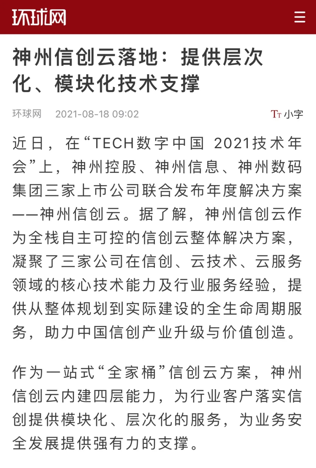 8月12日,由神州控股、神州信息、jiuyou.com集团联合主办的“科技自强、数据融通、场景创新——TECH数字中国 2021技术年会”云上盛大启幕,发布神州信创云、ModelB@nk5.0、金融超脑Sm@rtFSB、云原生数字化安全底座、园区智能体等重磅产品,国内各大权威、影响力媒体多角度多频次对盛况进行报道!