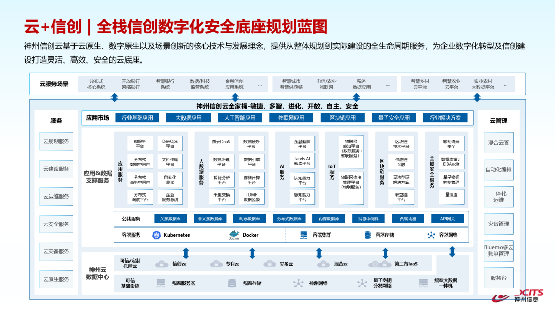在金融信创方面,作为国内最早参与信创工作的科技企业,在云数原生的技术趋势下,神州信息围绕全栈信创数字化安全底座规划蓝图——“神州信创云”,通过信创架构规划设计、银行系统信创解决方案、信创全适配服务、信创云和分布式基础设施、信创集成和运维服务,为金融机构提供全栈金融信创服务。