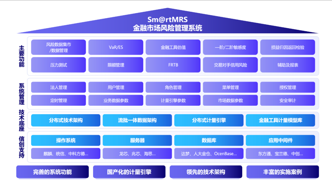 作为推动国内商业银行市场风险管理全面转型发展的新一代风险管理系统,Sm@rtMRS具有“国产化的计量引擎、体系化的数据管理、便捷的参数化配置和丰富的报表管理”等特点: